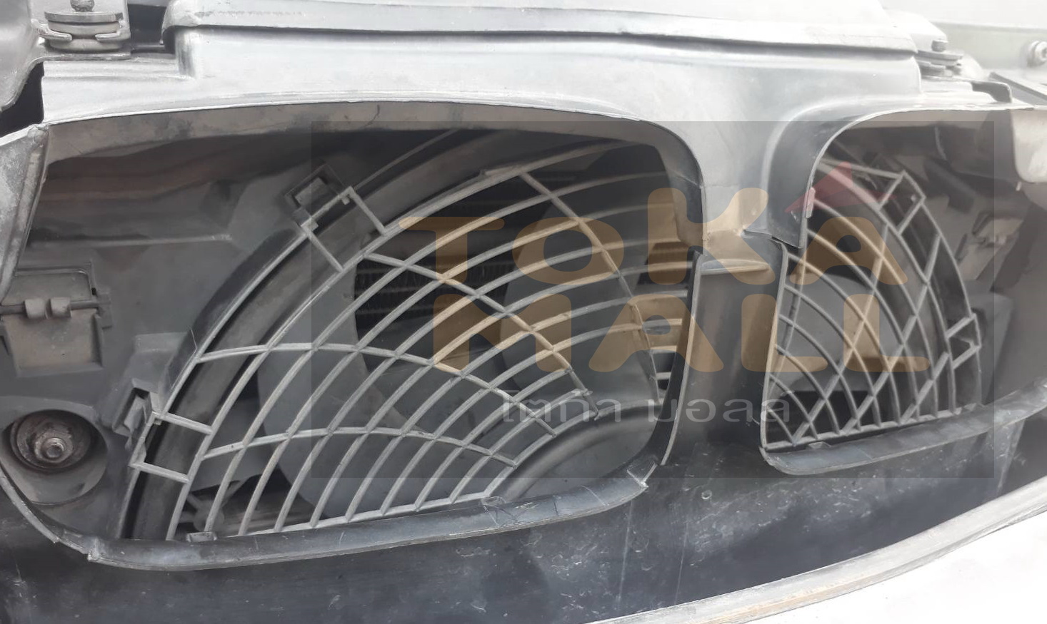 ขั้นตอนที่ 3 ถึงตอนนี้เราจะเห็นพัดลมเต็มตัว ให้ใช้ บล็อคเบอร์ 14 ไขน็อตทั้ง ซ้ายและขวา ข้างละ 2 ตัว รวม 4 ตัวออก ตามด้วยถอดปลั๊กสายไฟพัดลมออก ถอดพัดลมออกจากตัวรถ