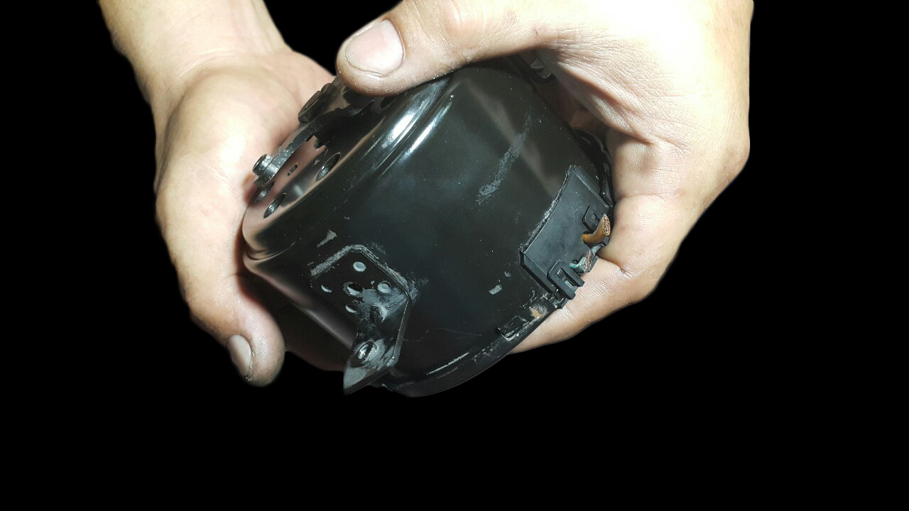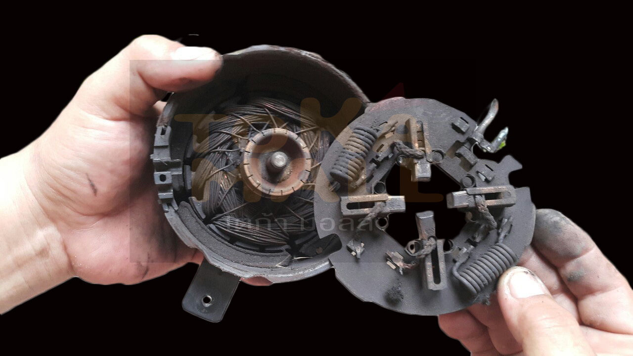 ขั้นตอนที่ 11 เริ่มประกอบกลับทุกชิ้นเข้าที่เดิม ฝาครอบท้ายมอเตอร์ ใต้ฝาจะมีตัวล็อค วางใส่ตามรูป และกดบิดไปทางตามเข็มนาฬิกา เข้าล็อคแล้วให้ใส่พลาสติกถ้าไม่ลงให้ขยับแผ่นฝาครอบท้ายจนพลาสติกลงเข้าที่ อย่าใจร้อนค่อยๆทำตามภาพ
