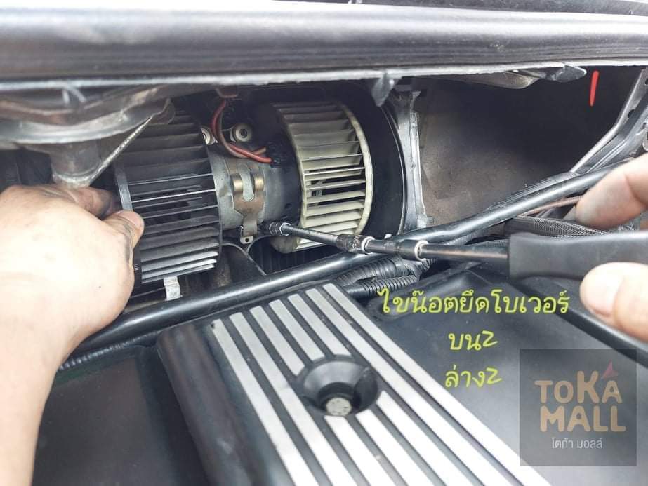 3. ตอนนี้เราจะเห็นตำแหน่งโบเวอร์อยู่แล้วครับ ใช้ T20ไขน็อตตรงกลางด้านบน1ตัว ใช้ปากแบนงัดขาล็อค(เหมือนตรงกรองอากาศที่เป็นขาเหล็กเกี่ยวยึดไว้)งัดออกทั้ง2ขาด้านล่าง ดึงเอาพลาสติกโครงด้านหน้าออกครับ